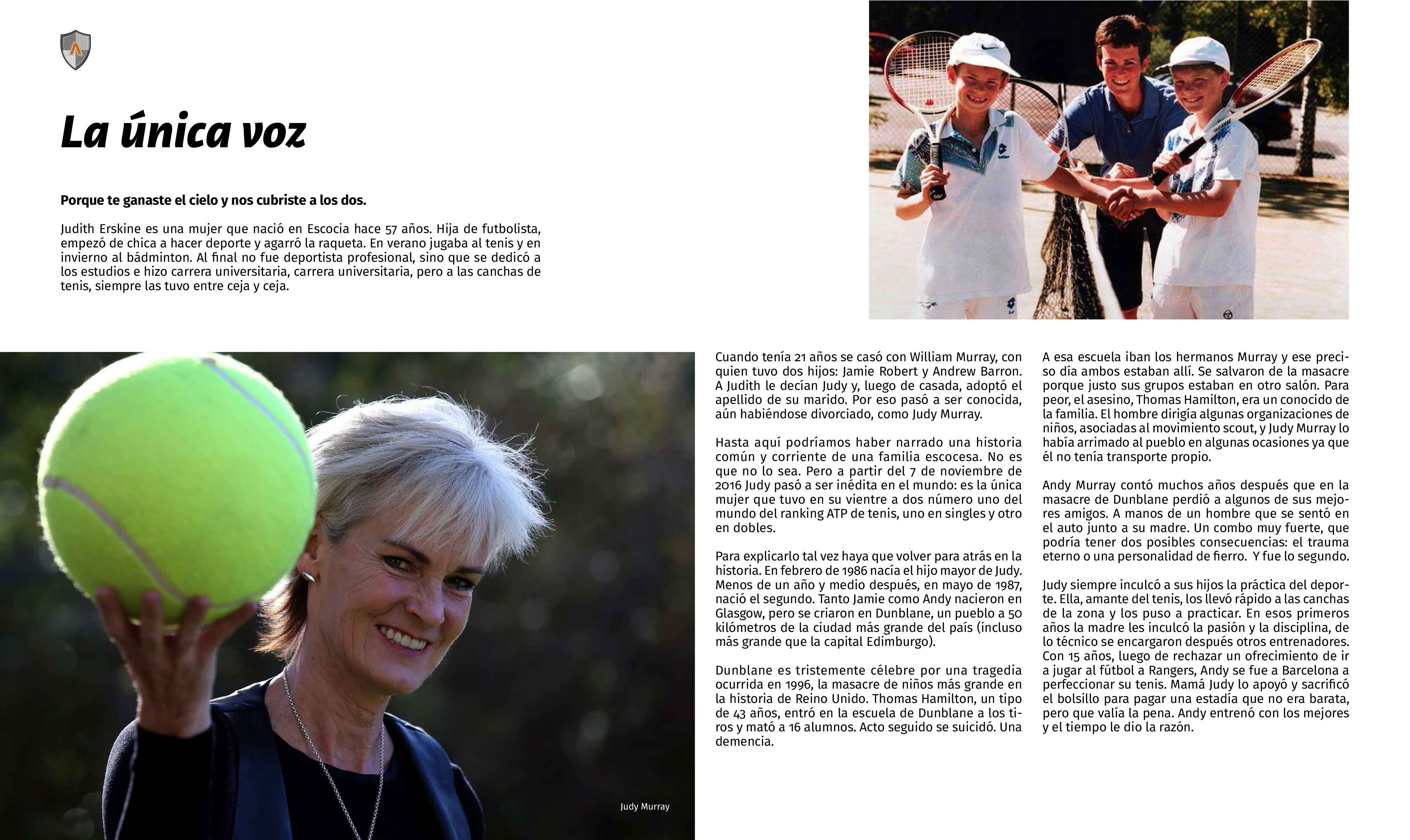 Judith Erskine es una mujer que nació en Escocia hace 57 años. Hija de futbolista, empezó de chica a hacer deporte y agarró la raqueta. En verano jugaba al tenis y en invierno al bádminton. Al final no fue deportista profesional, sino que se dedicó a los estudios e hizo carrera universitaria, pero las canchas de tenis siempre las tuvo entre ceja y ceja.